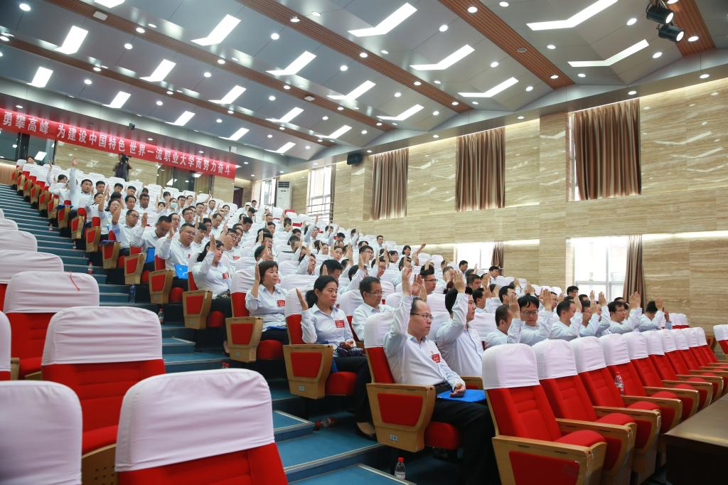 6月30日,中国共产党杨凌职业技术学院第二次代表大会在南校区醒钟楼思辩堂隆重召开。会场里悬挂着“凝心聚力 勇攀高峰 为建设中国特色世界一流职业大学而努力奋斗”的标语,主席台上金色的党徽和鲜艳的红旗分外夺目。