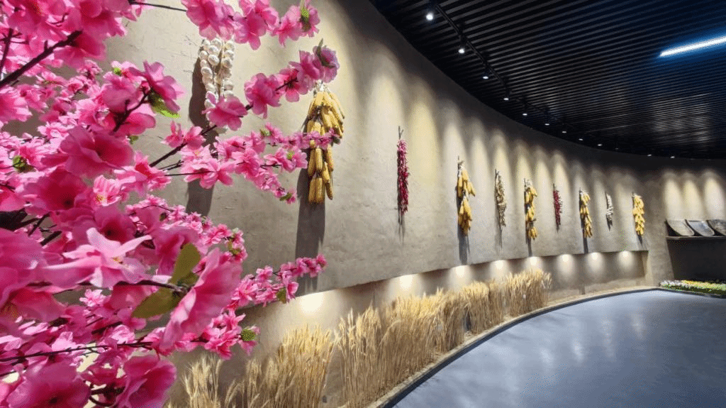 耕读体验展厅对隋代北方农家小院和古代学堂进行场景还原,其中农家小院展示的小麦、桃花、西瓜、草莓等实物均为我校科研成果。除此之外还有瓦罐、石碾、竹篮、水缸等古代农家生活用品,展现了真实的古代农家生活。