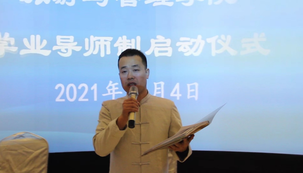 会议宣读旅游与管理学院启动学业导师制的决定从实施学业导师制的背景、基本理念、五个关键词、本学年师生互选名单四个方面对学业导师实施方案进行了深入解读。会上,全体师生齐声诵读《大学》,导师代表苟小亮了表态发言
