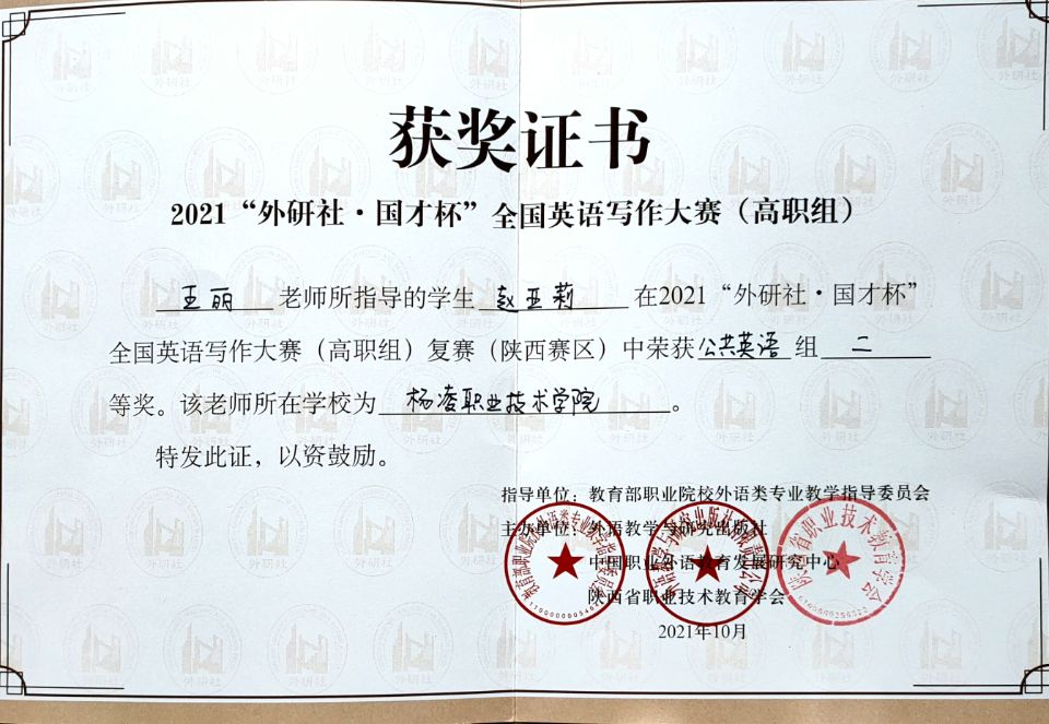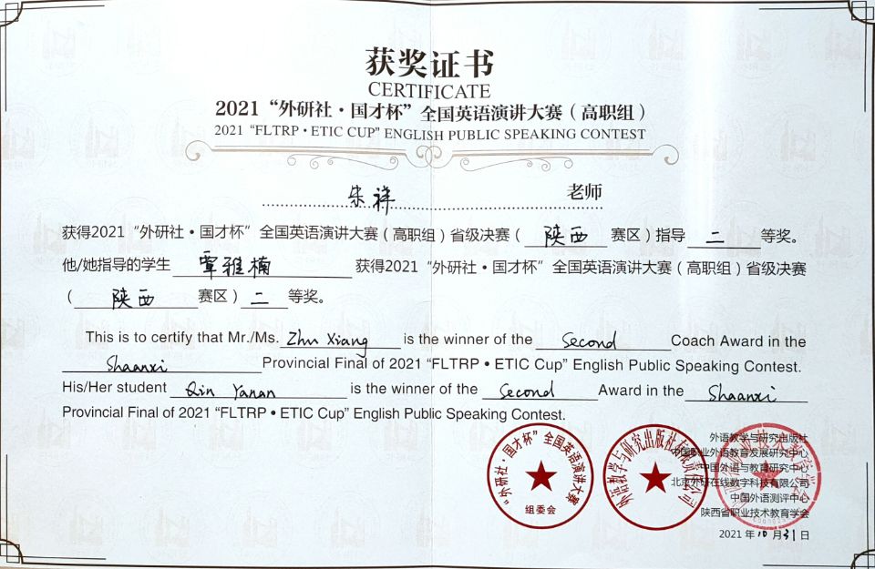 近日,2021“外研社·国才杯”全国大学生英语写作、演讲大赛(高职组)陕西赛区复赛成绩公布。我校学生闵琛轩获公共英语组写作大赛省级一等奖,赵亚莉获公共英语组写作大赛省级二等奖,覃雅楠获英语演讲大赛省级二等奖。
