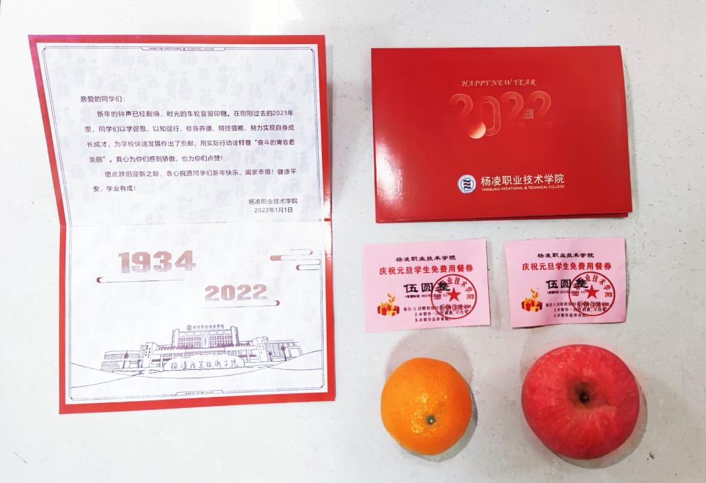 2021年12月31,伴随着2022年走来的脚步声,杨凌职业技术学院为同学们送上特别准备的新年祝福,党委书记陈宁,校长王周锁,党委副书记任得元,党委副书记、纪委书记王勇胜,副校长祝战斌、胡俊鹏等深入三校区学生宿舍每一位同学送上精心制作的新年贺卡、寓意平安的苹果寓意吉祥的橘子和两张餐券,让学生们感受到了浓浓的关爱和节日气氛。
