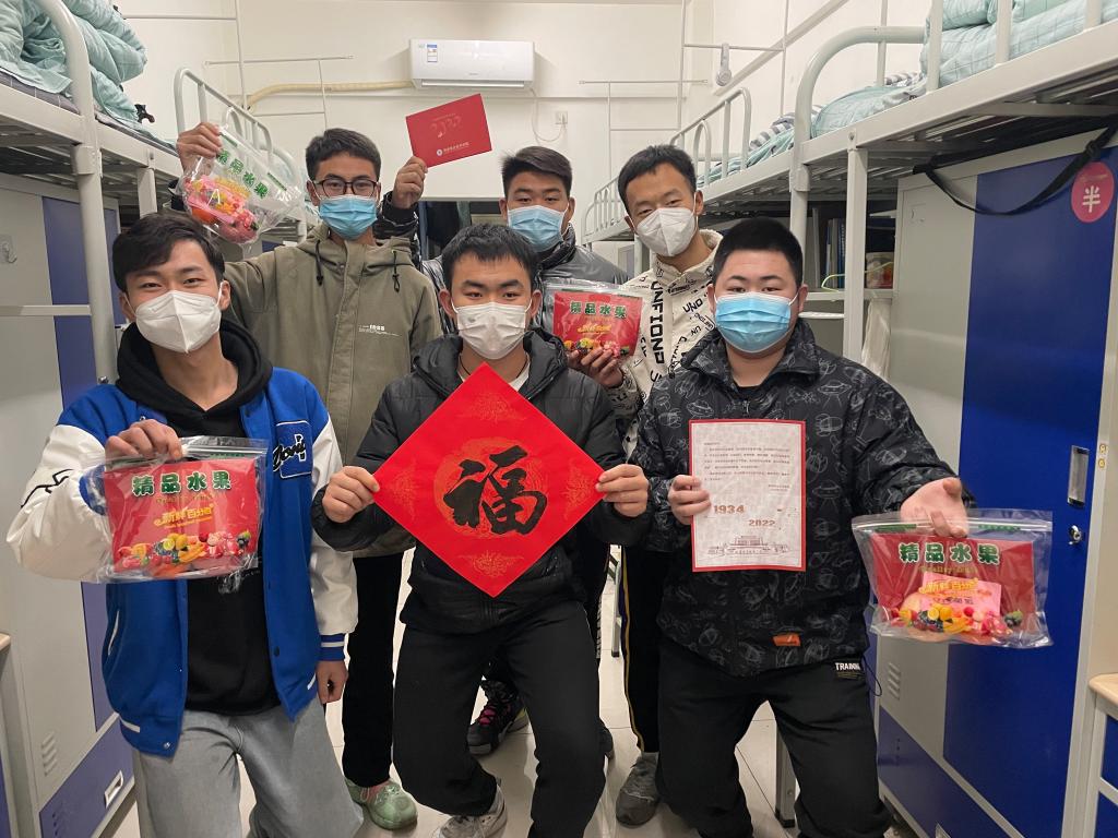 每到一个宿舍,学校领导们都亲切的与同学们交流,了解大家的思想动态和学习生活情况,并通过“苹”安“橘”祥的新年礼物,祝大家在新的一年平安吉祥、学业有成,为取得更大成绩、实现自我梦想奠定扎实基础。领导们叮嘱大家,一是要科学防疫、健康成长,在做好自我防护的同时,合理安排好学习生活,保持积极向上、理性思考的精神状态。二是要加强与老师、家人的沟通交流,理解当前特殊时期学校所采取的管理措施及规定,坚定战胜困难的信念信心,在防疫斗争中磨炼意志、淬炼思想,配合学校共同做好疫情防控工作。
