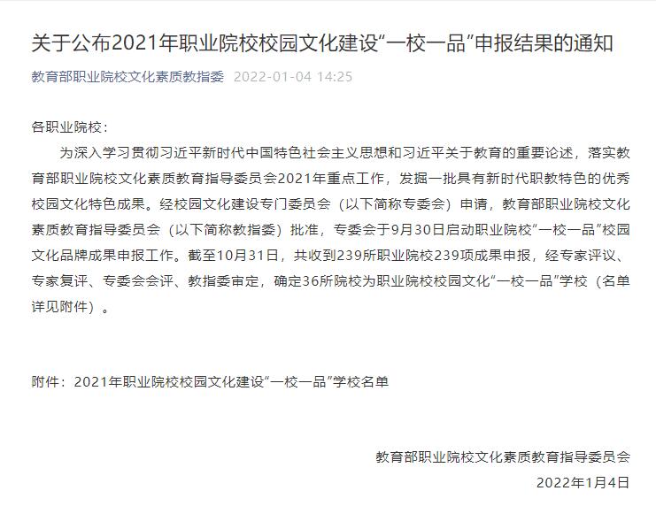1月4日,教育部职业院校文化素质教育指导委员会公布了2021年全国职业院校校园文化建设“一校一品”申报结果,我校“后稷文化”品牌成功入选。学校荣获全国职业院校校园文化“一校一品”学校称号。