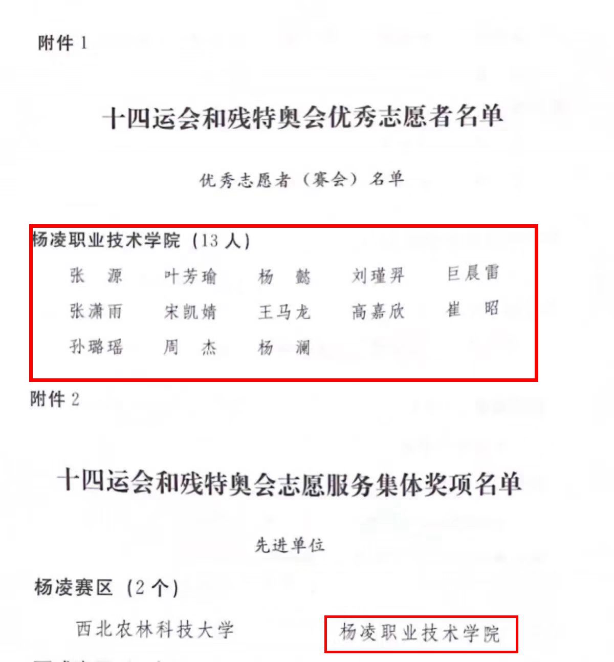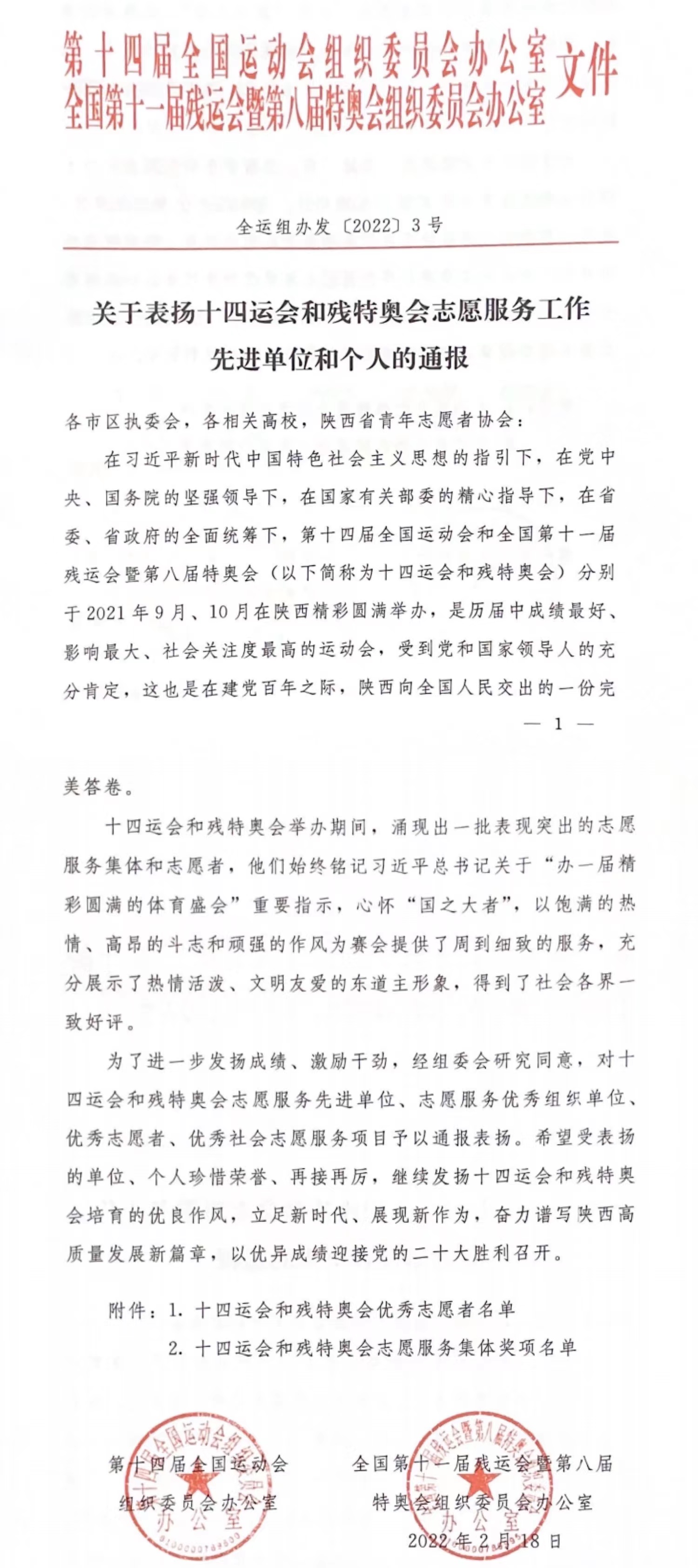2021年9月,第十四届全国运动会全面启动以来,我校260名团员青年志愿服务十四运会和残特奥会赛艇、皮划艇(静水)项目,积极参与火炬传递活动(杨凌示范区站),以饱满的热情、专业的服务圆满完成了赛事期间各项志愿服务工作,赢得了组委会、参赛运动员和裁判员的一致好评,展现了当代大学生蓬勃向上的精神风貌和无私奉献的志愿精神。经组委会研究同意,予以通报表扬。