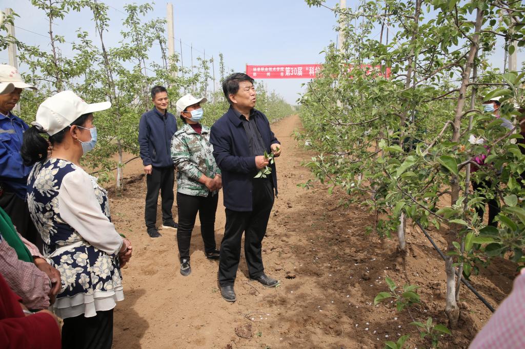 眼下正值苹果疏花时节,活动当天,杨凌职院果树专家马文哲教授深入彬州市田间地头,为当地果农朋友进行苹果疏花技能指导培训。
