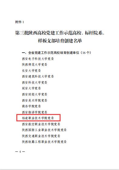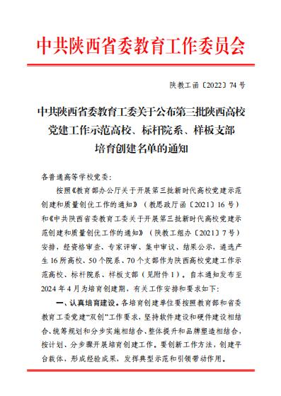 4年来,校党委获批全省党建工作示范高校,学校获批全国党建工作样板支部1个,陕西省“双带头人”教师党支部书记工作室1个,陕西省党建工作标杆院系2个、样板支部2个。