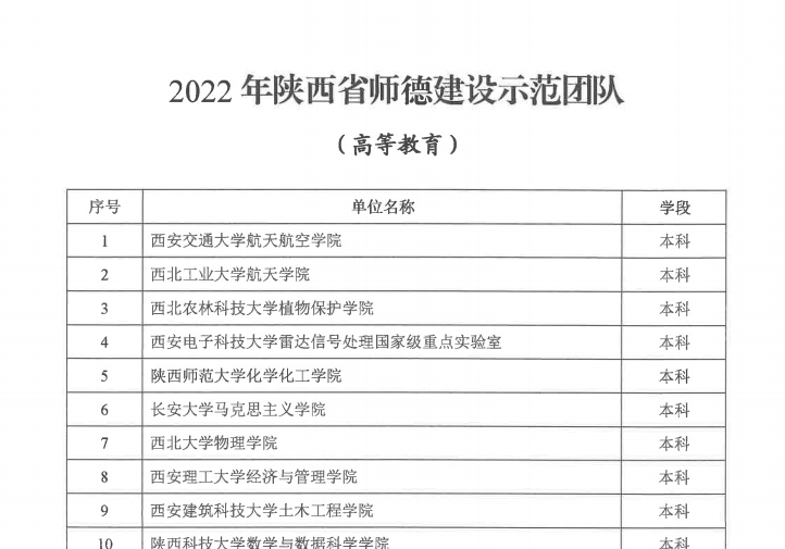 近日,陕西省教育厅、陕西省教科文卫体工会委员会联合发文,公布2022年陕西省师德标兵、师德建设示范团队、黄大年式教师团队和陕西省教育世家名单。我校水利工程学院赵英老师获评陕西省师德标兵,生物工程学院被命名为陕西省师德建设示范团队,动物工程学院畜牧兽医教师团队入选陕西省高校黄大年式教师团队,药物与化工学院刘玉凤家庭获陕西省教育世家荣誉称号。
