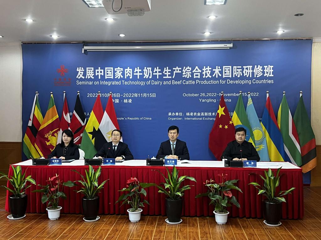 11月15日,杨凌职业技术学院协办的国家商务部2022年发展中国家肉牛奶牛生产综合技术国际研修班结业典礼举行。省商务厅二级巡视员昌利,杨凌示范区管委会副秘书长杨天锋,学校国际合作交流处副处长杨雪霁出席结业典礼,来自肯尼亚、赞比亚、埃塞俄比亚、尼泊尔、津巴布韦、埃及、斯里兰卡、哈萨克斯坦、南非、毛里求斯、加纳等11个国家的38名学员在线上参加活动。结业典礼由上合组织农业基地工作办公室副主任李瑞主持。