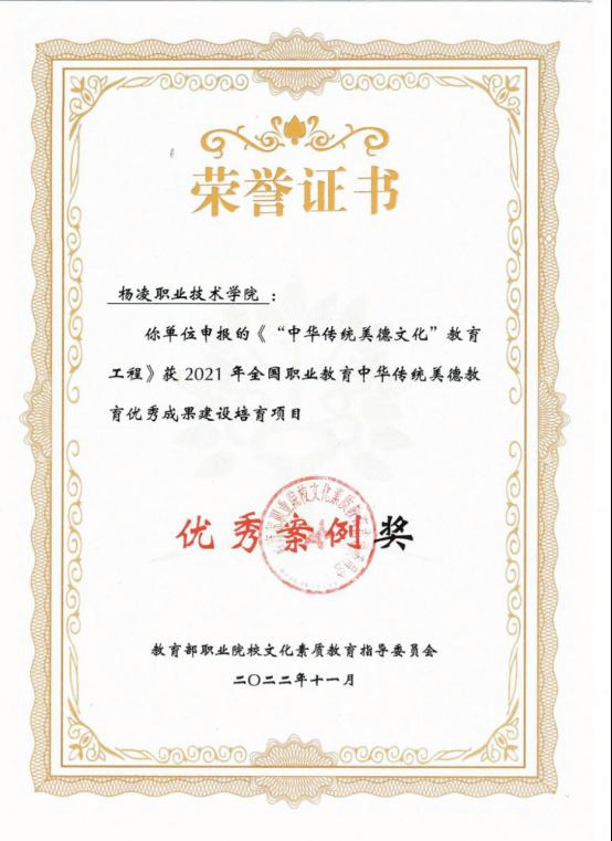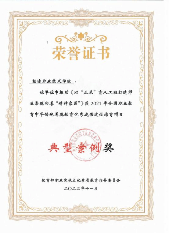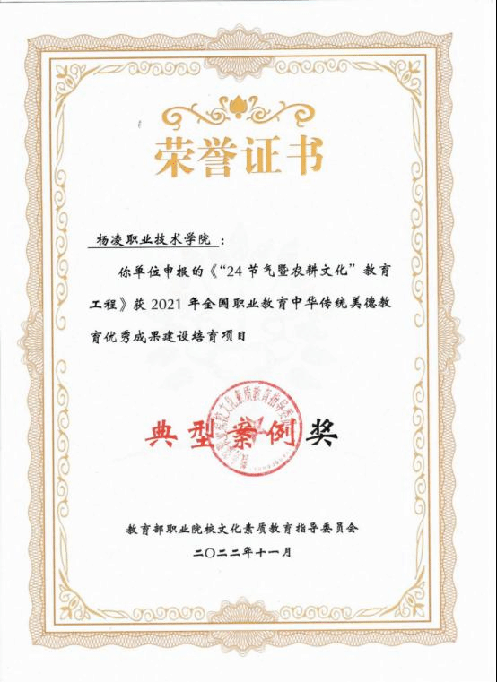 4月23日,教育部职业院校文化素质教育指导委员会颁发了全国职业教育中华传统美德教育优秀成果建设培育项目典型案例奖、优秀案例奖和优秀成果奖证书。其中,《以“正禾育人工程打造师生崇德向善“精神家园”》、《“24节气暨农耕文化”教育工程》荣获典型案例奖,《“中华优秀美德文化”教育工程》荣获优秀案例奖,《中华传统美德文化卧谈30篇》荣获优秀成果奖。