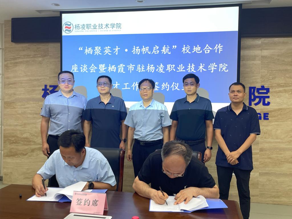 7月3日,学校与山东省栖霞市“栖聚英才、扬帆启航”校地合作座谈会暨栖霞市驻杨凌职业技术学院人才工作站签约仪式在南校区举行。栖霞市人社局党组书记、局长刘盛田,副校长张朝晖、招就处处长李岩、信息工程学院党总支副书记吴高潮等参加会议。