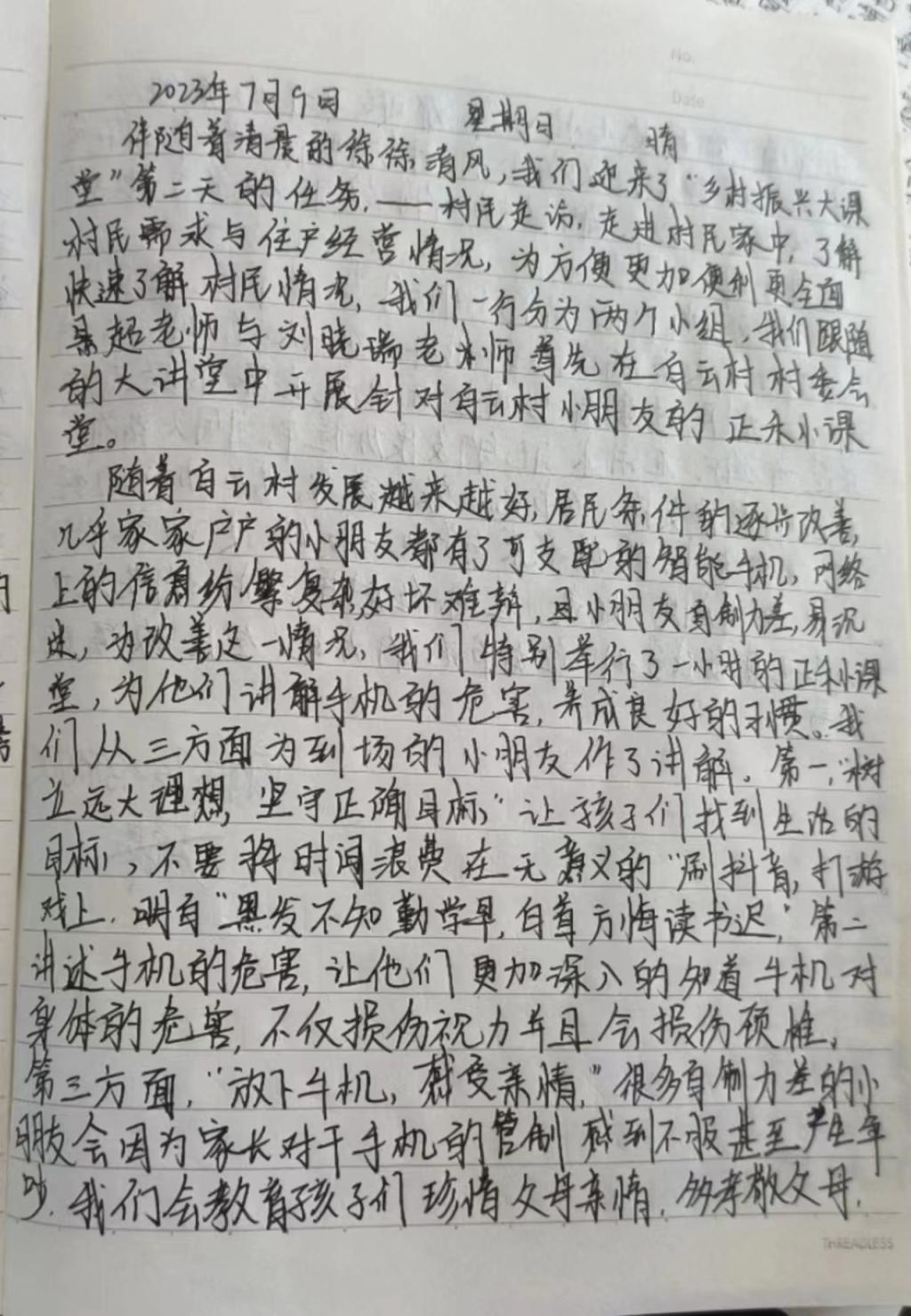 ——开展了一场实践材料撰写辅导,助力人才培养。此次活动中,要求参与的8名学生每天撰写800余字的《我的乡村日记》和一篇不少于2000字的心得体会。《我的乡村日记》和心得体会撰写过程中,参与教师及时为学生提供一对一指导,确保学生有参与、有感悟、有收获。