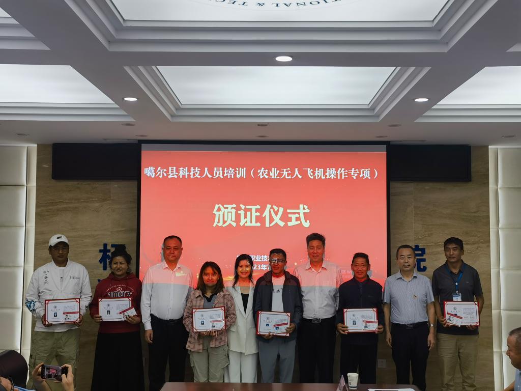 座谈会上,张松梅、郭杰、马江涛、胡俊鹏为次旺多吉、贡觉卓玛、益西旺扎、边巴欧珠、美朵卓玛、次仁六位学员颁发了农业无人机操作员证书。张松梅与六位学员进行了亲切的交流。胡俊鹏介绍了学校的基本情况,特别是我校发挥全国乡村振兴人才培养优质校优势,利用涉农专业和科技创新与社会服务的特色,在中省市县各级积极开展科技培训的情况。黄璞汇报了西藏阿里地区噶尔县科技人员素质提升专题培训班的开展情况。六位学员各自发言表达了对本次培训的感想感受。