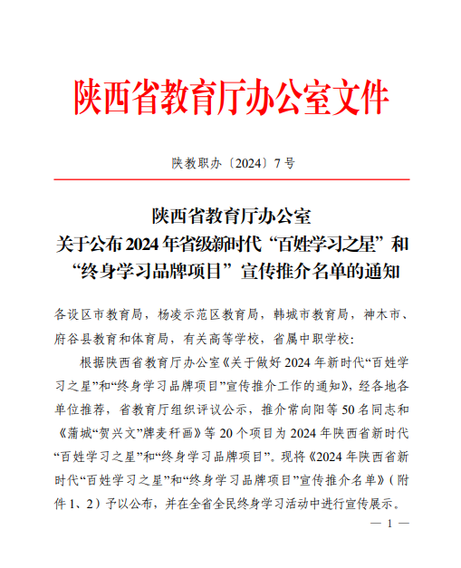 近日,省教育厅公布了2024 年省级新时代“百姓学习之星”和“终身学习品牌项目”宣传推介名单,我校动物工程学院副教授贾燕青荣获陕西省“百姓学习之星”荣誉称号。