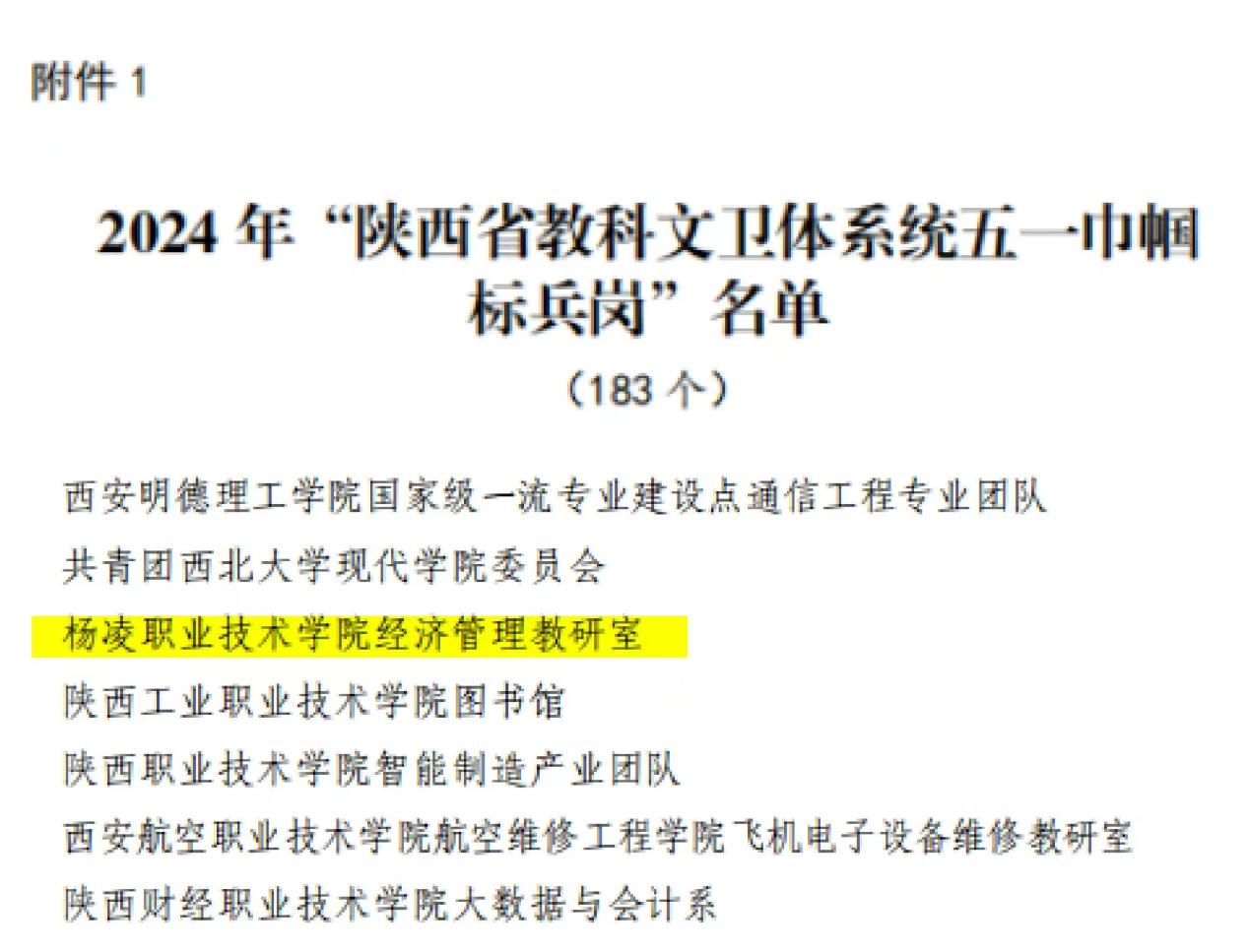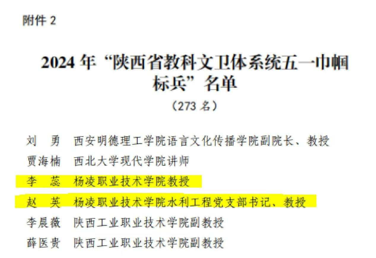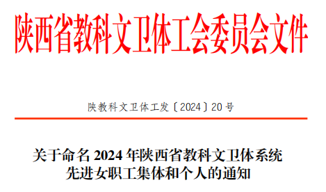 近日,陕西省教科文卫体工会委员会命名表彰了2024年陕西省教科文卫体系统“五一巾帼标兵岗”和“五一巾帼标兵”。我校经济与贸易学院经济管理教研室获“五一巾帼标兵岗”称号,文理学院教师李蕊和水利工程学院教师赵英获“五一巾帼标兵”称号。