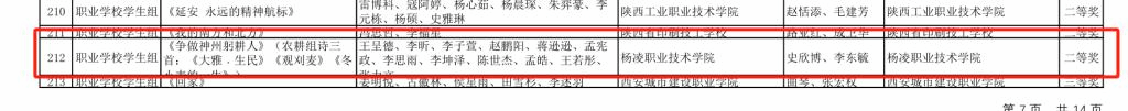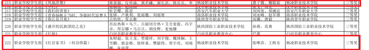 自大赛启动以来,我校师生积极响应,深入挖掘经典文化内涵,通过不断筛选打磨,推选《争做神州躬耕人》《凤凰涅槃》《红岩家书》《唐诗里的中国》《英雄》5部作品参加陕西省赛。王呈德等12名学生获职业学校学生组二等奖并成功入围国赛,熊聂锱、朱财超等18名学生作品获职业学校学生组三等奖,文理学院教师史欣博等4名教师作品获教师组优秀奖。