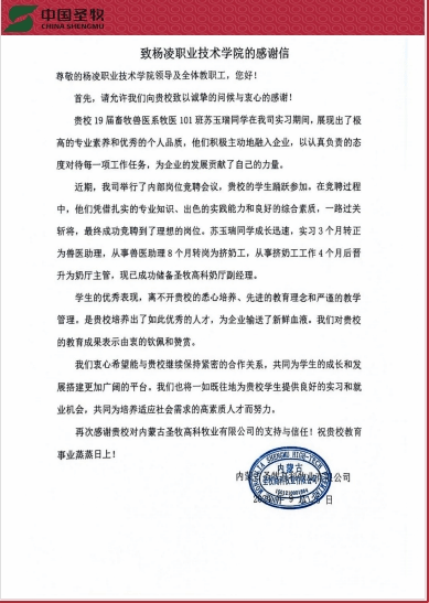 9月25日,内蒙古圣牧高科牧业有限公司向我校发来感谢信,诚挚感谢我校培养出众多优秀人才,为企业输送了新鲜血液。