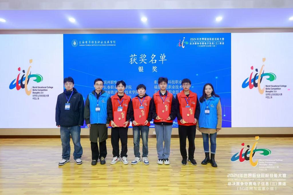 10月25日至28日,2024年世界职业院校技能大赛总决赛争夺赛电子信息(三)赛道“5G组网与运维”赛项在上海市上海电子信息职业技术学院举办,共有来自全国31个省、市、自治区的61支参赛队伍同台竞技。我校信息工程学院樊勇杰、南疆、陈维浩、杨光照组成的学生团队,凭借着超强的心理素质和扎实的专业技能,荣获该赛项银奖。