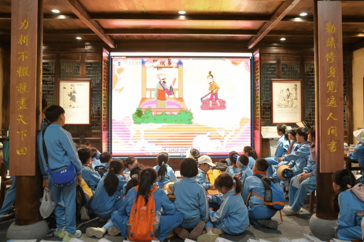 在校史馆,学生们沉浸式感受学校91年办学历程;耕读文化馆内,学生们看到镰刀、连枷、曲辕犁、纺车等展陈的实物农具,纷纷感慨古代劳动人民劳作的辛勤;“二牛抬杠”的模拟场景让古人智慧“触手可及”;讲解志愿者带领学生们朗诵“二十四节气歌”,并通过观看动画短片《耕读:农耕文明传承千年的基因密码》,系统梳理了农耕时期农业技术的发展脉络,厚植知农、爱农情怀。
