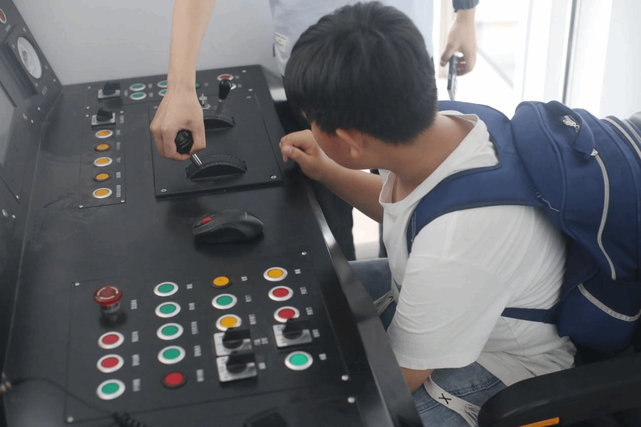 走进城市轨道实训中心,学生们一下子就被地铁所吸引,“杨职站”仓门一开,学生们有序乘坐地铁。模拟驾驶舱里,大家轮流实操,在老师指导下学习启动、加速、制动等操作,惊叹于地铁驾驶的专业与复杂。