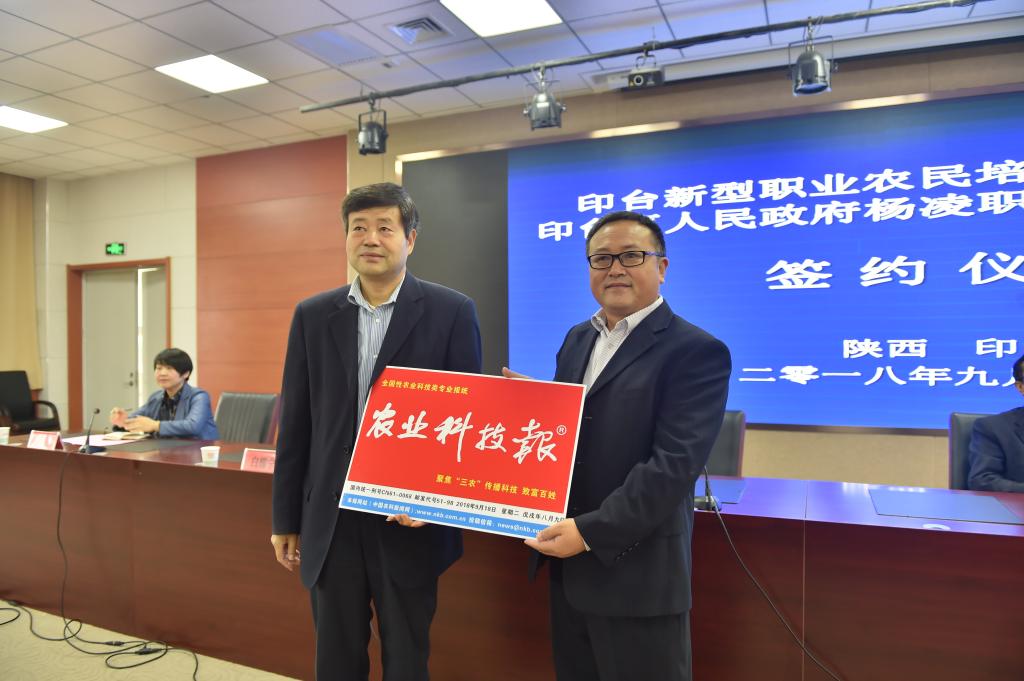 签约仪式上,任得元与马海峰共同为印台新型职业农民培育学院揭牌,双方签订了《关于加强产学研结合促进经济发展的合作协议》,学院向印台区镇办、贫困村赠阅了价值2.3万元的27个月65份农业科技报。
