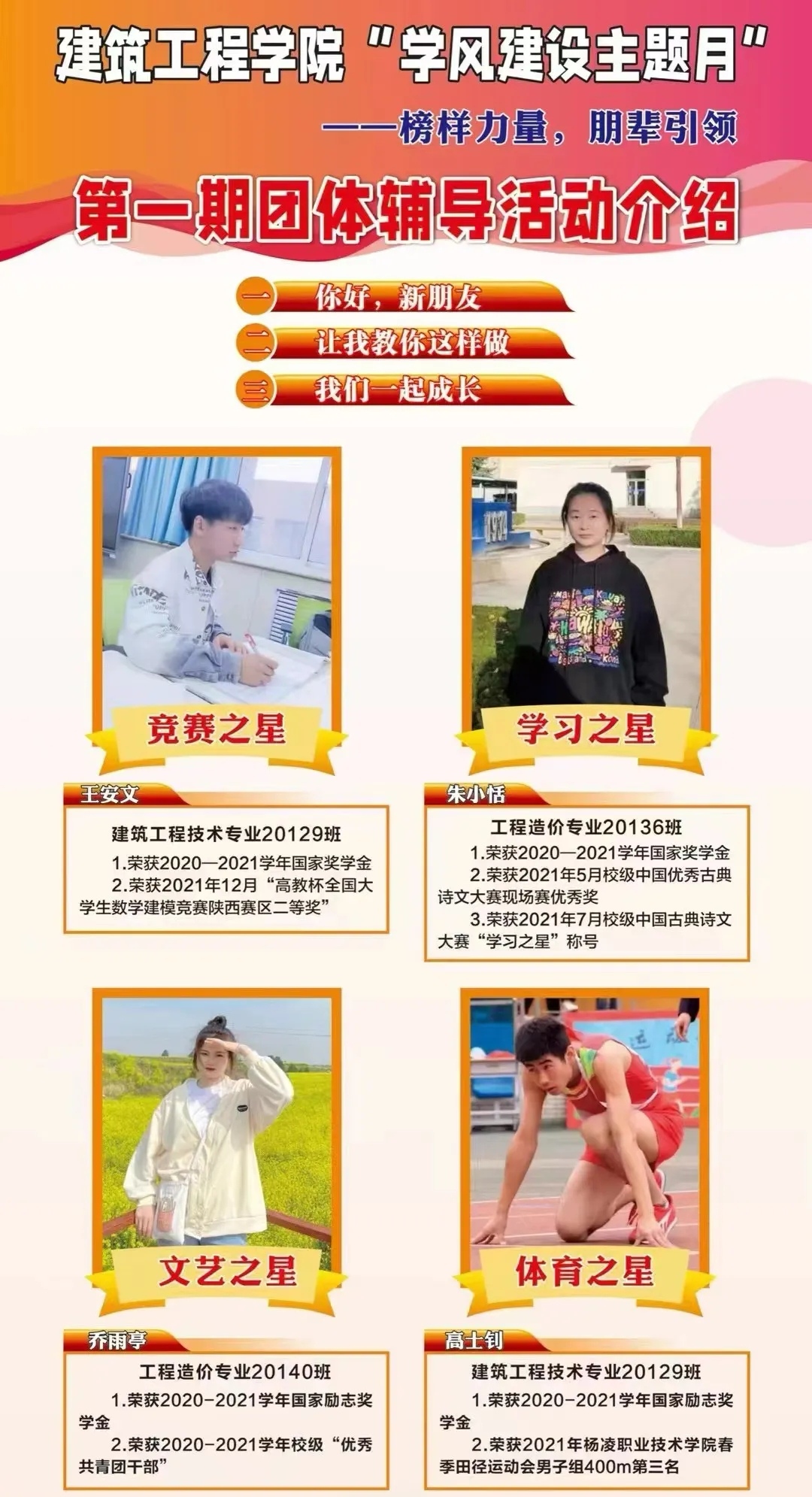 ——营造学习氛围,弘扬榜样力量。在大一、大二举办了“榜样力量,朋辈引领”学习经验交流会。对获得国家奖学金、国家励志奖学金的优秀学生进行宣传报道,号召广大学生向先进榜样学习,在各班级营造“比学赶帮超”的良好学习氛围。优秀学生代表的经验分享成为建工学子学习的动力,让朋辈引导成为学风建设的抓手。