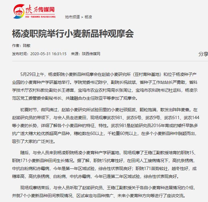 随后,与会人员来到杨凌职院杨凌小麦育种产学研基地,现场观摩了王稳江副教授培育的职院15、职院171小麦新品种田间生长情况。据了解,职院15抗寒性好,在田间人工接病情况下,高抗条锈病,中抗白粉病和赤霉病,今年是第一年区域试验,综合性状表现良好;职院171苗势较壮,越冬性好,成穗率高,高抗条锈病、白粉病,中抗赤霉病,今年已是第二年区域试验,综合性状表现良好。