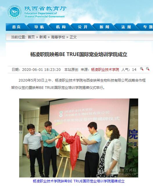 2020年5月30日上午,杨凌职业技术学院与西安映希生物科技有限公司战略合作框架协议签约暨映希BE TRUE国际宠业培训学院揭牌仪式举行。