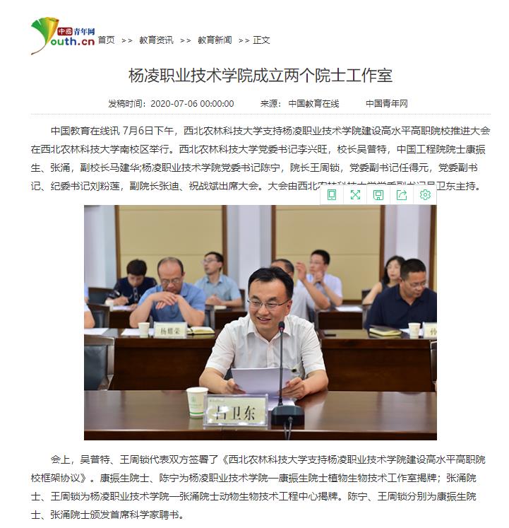 会上,吴普特、王周锁代表双方签署了《西北农林科技大学支持杨凌职业技术学院建设高水平高职院校框架协议》。康振生院士、陈宁为杨凌职业技术学院—康振生院士植物生物技术工作室揭牌;张涌院士、王周锁为杨凌职业技术学院—张涌院士动物生物技术工程中心揭牌。陈宁、王周锁分别为康振生院士、张涌院士颁发首席科学家聘书。