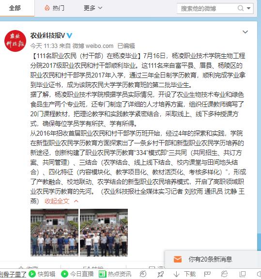 从2016年招收首届职业农民和村干部学历班开始,经过4年的探索和实践,学院在新型职业农民学历教育方面探索出了一条乡村干部和新型职业农民学历培养的新途径,创新构建了职业农民学历教育“334”模式即“三共同(共同招生、共订方案、共同管理)、三结合(农学结合、线上线下结合、校内课堂与田间地头结合)、四化特征(内容模块化、教学项目化、教材活页化、考核多样化)”,形成了产教融合、校地联动、农学结合的新型职业农民培养模式,开启了高职领域职业农民学历教育的先河。(农业科技报社全媒体实习记者 刘欣雨 通讯员 沈静 王燕)