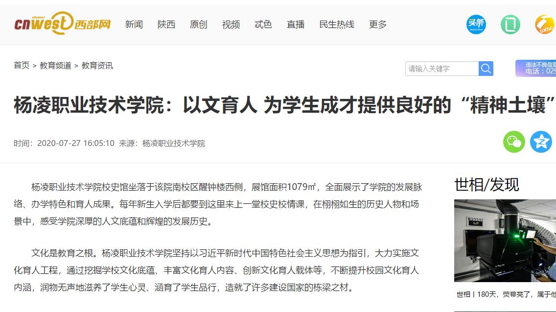 校园文化是一所学校精神风貌和办学特色的体现。近年来,杨凌职业技术学院常态化、制度化开展八大品牌育人工程,构建了全方位文化育人体系。实施“社会主义先进文化”教育工程,弘扬社会主义先进文化,坚定学生的四个自信和三个认同;实施“十大节庆”主题教育工程,遴选10个中华优秀传统节日,大力培育和践行社会主义核心价值观;实施“中华经典晨读”教育工程,用中华优秀经典文化教育培养、感染熏陶学生;实施“二十四节气暨农耕文化”教育工程,培养学生知农学农爱农情怀,彰显涉农院校育人特色;实施“学生社团百千万建设”工程,以学生社团为载体,开展思想政治教育、教育教学改革、团学管理、校园文化建设;实施“十大中华民族精神”教育工程,着力培育学生的民族精神和民族气节;实施“十大励志人物”励志教育工程,感召、感染、教育学生健康成长、励志成才;实施“双百励志”教育工程,着力培育学生红色基因。