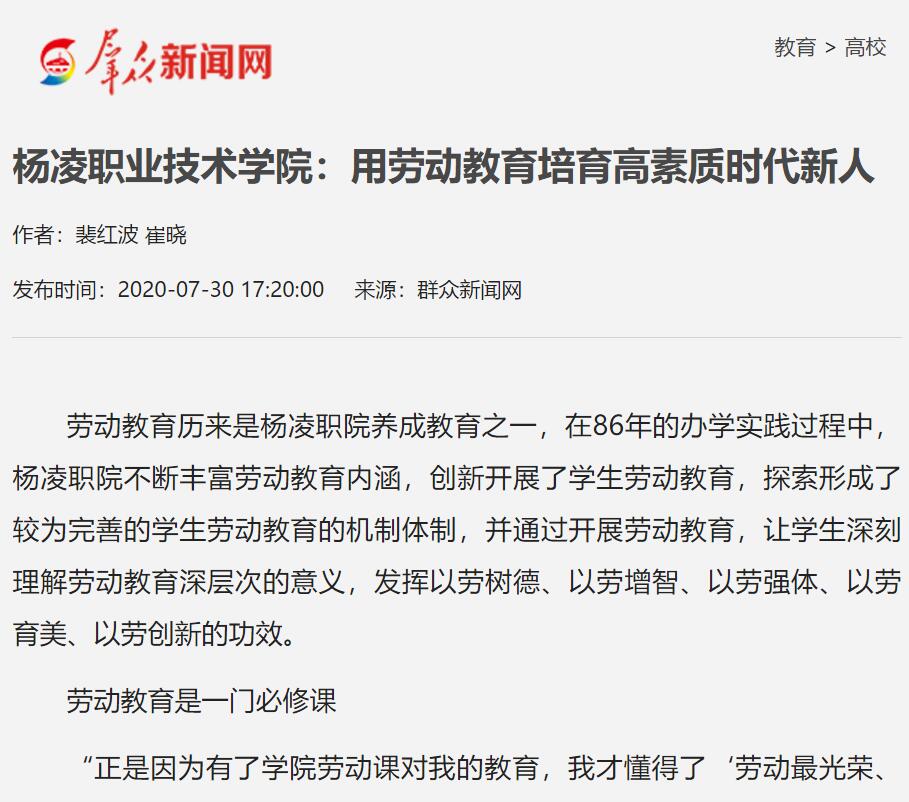 劳动教育历来是杨凌职院养成教育之一,在86年的办学实践过程中,杨凌职院不断丰富劳动教育内涵,创新开展了学生劳动教育,探索形成了较为完善的学生劳动教育的机制体制,并通过开展劳动教育,让学生深刻理解劳动教育深层次的意义,发挥以劳树德、以劳增智、以劳强体、以劳育美、以劳创新的功效。