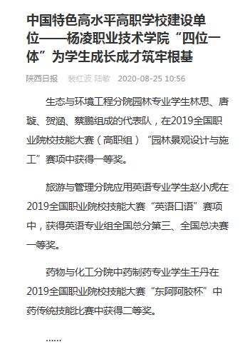 近年来,杨凌职院在全院深入实施以学分为导向的“通识教育+专业教育+个性发展教育+创新创业教育”四位一体人才培养方案,培养了一批思想品德好、专业知识精、实践能力强和创新意识浓的学生,学院的知名度和美誉度不断提升。