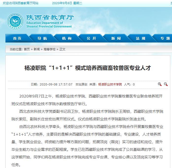 2020年9月7日上午,杨凌职业技术学院、西藏职业技术学院畜牧兽医专业联合培养班开班仪式在杨凌职业技术学院水韵楼报告厅举行。