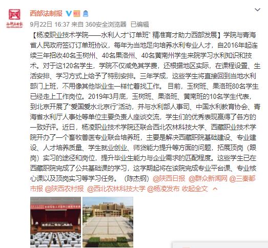 学院与青海省人民政府签订订单班协议,每年为当地足向培养水利专业人才,自2016年起连续三年招收40名玉树州、40名果洛州、40名黄南州学生来院学习水利知识和技术。对于这120名学生,学院不仅减免其学费,还根据地区实际,在课程设置、生活安排、学习方式上给予了特别安排。三年学成,这些学生将直接回到当地水利部门上班,不用像其他毕业生一样忙着找工作。 目前,玉树班、果洛班80名学生已经走上工作岗位。2019年3月底,玉树班、果洛班、黄南班的10名学生代表,到北京开展了“爱国爱水北京行”活动,并与水利部人事司、中国水利教育协会、青海省水利厅人事处等单位主要负责人座谈交流,学生们的优秀表现赢得了各方的一致好评。近日,杨凌职业技术学院还联合西北农林科技大学、西藏职业技术学院开办了一个畜牧兽医专业联合培养班,主要是解决西藏职院基础建设、专业建设、人才培养质量、学生就业创业、师贷能力提升等方面的问题,拓展顶岗(跟岗)实习的途径和岗位,提升毕业生能力与企业需求的匹配程度。这些学生已在西藏职院完成了公共基础课的学习,这学期起将在该院完成专业平台课、专业核心课以及顶岗实习等学习任务。(陈杰钢)