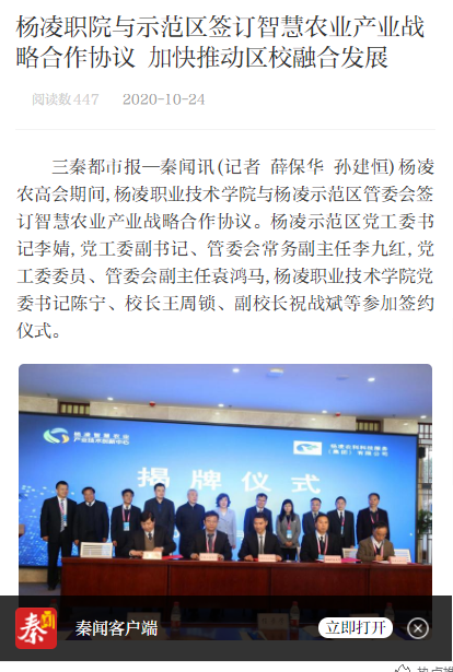 三秦都市报—秦闻讯(记者 薛保华 孙建恒)杨凌农高会期间,杨凌职业技术学院与杨凌示范区管委会签订智慧农业产业战略合作协议。杨凌示范区党工委书记李婧,党工委副书记、管委会常务副主任李九红,党工委委员、管委会副主任袁鸿马,杨凌职业技术学院党委书记陈宁、校长王周锁、副校长祝战斌等参加签约仪式。