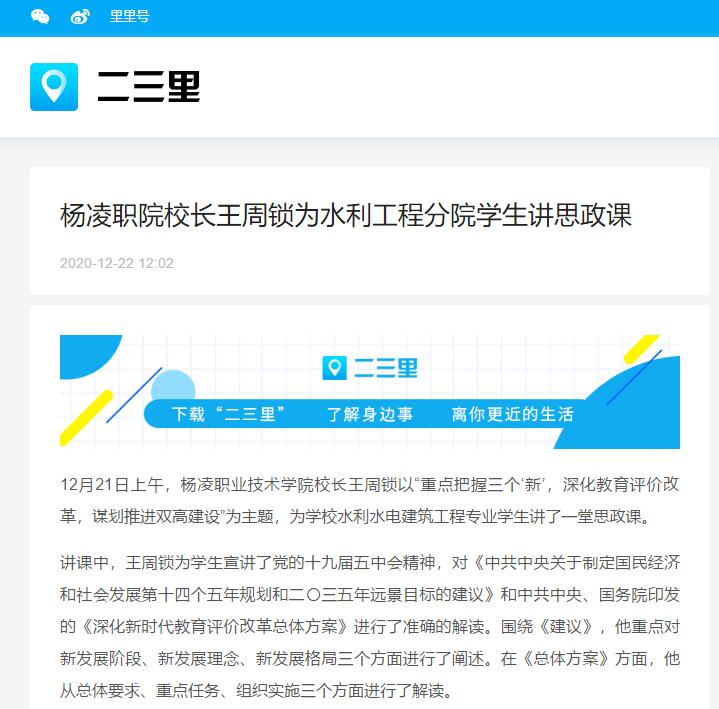 12月21日上午,杨凌职业技术学院校长王周锁以“重点把握三个‘新’,深化教育评价改革,谋划推进双高建设”为主题,为学校水利水电建筑工程专业学生讲了一堂思政课。