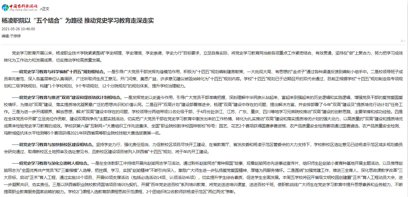 ——将党史学习教育与服务乡村振兴相结合。一是面向杨凌及周边农村打造党史学习教育“移动课堂”,发起“学习百年党史 筑梦乡村振兴”——“杨职号”党史学习教育宣传大篷车,通过讲述党史故事、发放党史资料、一刻钟微党课等形式,引导广大党员群众重温革命传统、传承革命精神、凝聚奋进力量。二是以陕西省高素质农民培训班举办为契机,开展“百年党史进千村”学习教育活动,通过重温入党誓词、同唱红色歌曲、共上一堂党课等形式,把学习百年党史与乡村振兴战略相结合,把党史学习教育培训和高素质农民培养贯通起来,让广大涉农工作者进一步学习了解党史,了解党的光荣传统、宝贵经验和伟大成就,做到知史爱党、知史爱国。学校获农业农村部和教育部乡村振兴人才培养优质校、陕西省2020年度“双百工程”先进单位。