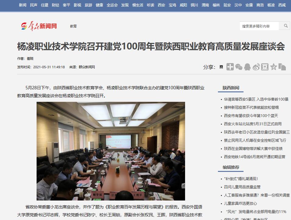 5月28日下午,由陕西省职业技术教育学会、杨凌职业技术学院联合主办的建党100周年暨陕西职业教育高质量发展座谈会在杨凌职业技术学院召开。