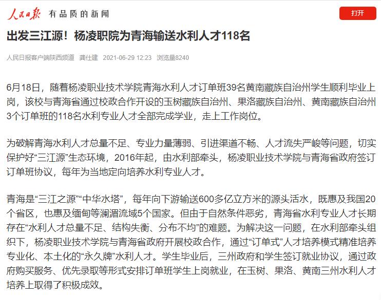 为破解青海水利人才总量不足、专业力量薄弱、引进渠道不畅、人才流失严峻等问题,切实保护好“三江源”生态环境,2016年起,由水利部牵头,杨凌职业技术学院与青海省政府签订订单班协议,每年为当地定向培养水利专业人才。