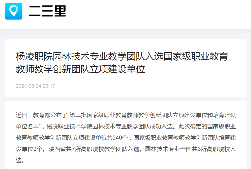 近日,教育部公布了“第二批国家级职业教育教师教学创新团队立项建设单位和培育建设单位名单”,杨凌职业技术学院园林技术专业教学团队成功入选。此次确定的国家级职业教育教师教学创新团队立项建设单位共240个,国家级职业教育教师教学创新团队培育建设单位2个。陕西省共7所高职院校教学团队入选。园林技术专业全国共3所高职院校入选。