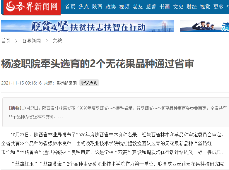 10月27日,陕西省林业局发布了2020年度陕西省林木良种名录,经陕西省林木和草品种审定委员会审定,全省共有33个品种为省级林木良种。由杨凌职业技术学院钱拴提教授团队选育的无花果新品种“丝路红玉”和“丝路黄金”通过省级林木良种审定,这是学校“双高”建设和提质培优行动计划的又一标志性成果。