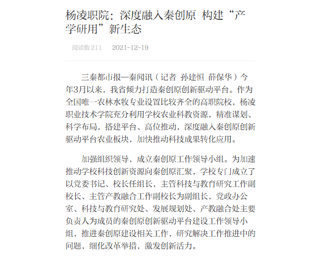 三秦都市报—秦闻讯(记者 孙建恒 薛保华)今年3月以来,我省倾力打造秦创原创新驱动平台。作为全国唯一农林水牧专业设置比较齐全的高职院校,杨凌职业技术学院充分利用学校农业科教资源,精准谋划、科学布局,搭建平台、高位推动,深度融入秦创原创新驱动平台农业板块,加快推动科技成果转化应用。