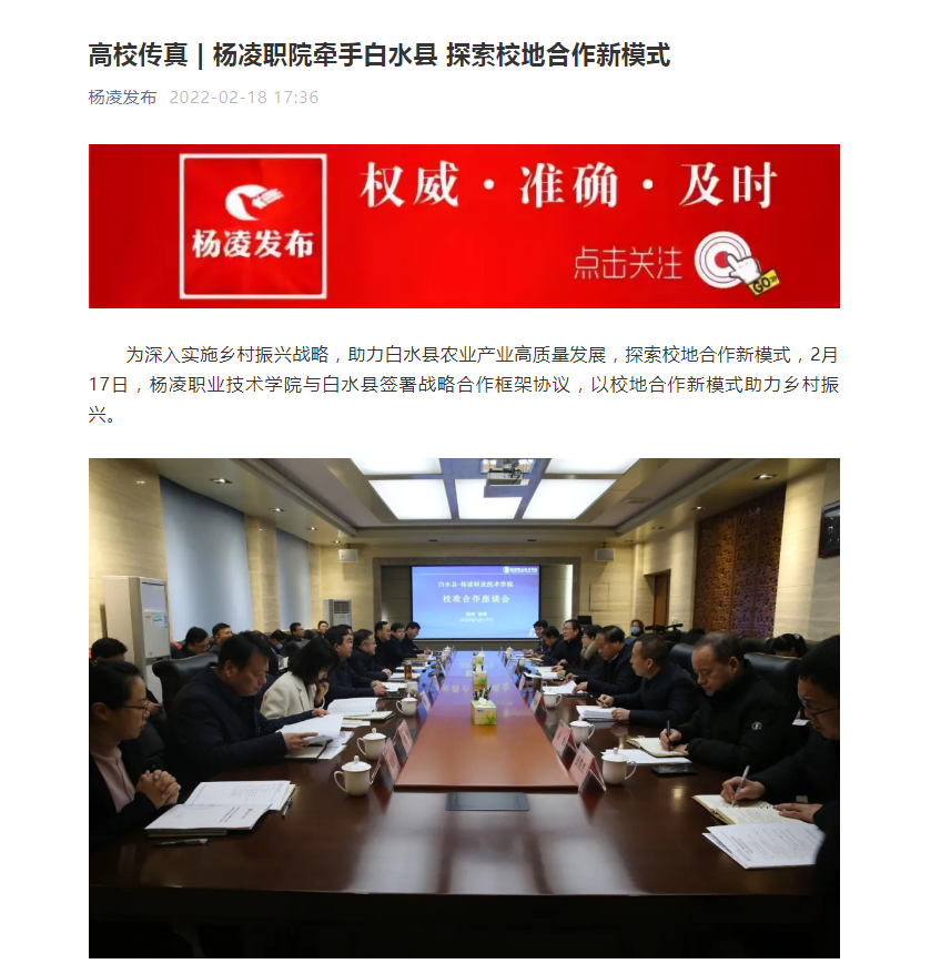 为深入实施乡村振兴战略,助力白水县农业产业高质量发展,探索校地合作新模式,2月17日,杨凌职业技术学院与白水县签署战略合作框架协议,以校地合作新模式助力乡村振兴。