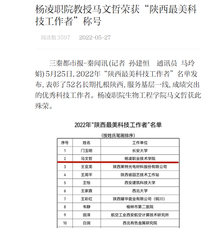 三秦都市报-秦闻讯(记者 孙建恒 通讯员 马玲娟)5月25日,2022年“陕西最美科技工作者”名单发布,表彰了52名长期扎根陕西,服务基层一线,成绩突出的优秀科技工作者。杨凌职院生物工程学院马文哲获此殊荣。