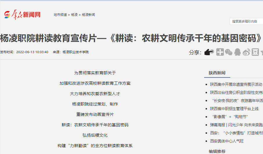 为贯彻落实教育部关于《加强和改进涉农高校耕读教育工作方案》,大力培养知农爱农新型人才,杨凌职院经过策划、制作,重磅发布动画宣传片《耕读:农耕文明传承千年的基因密码》,弘扬后稷文化,构建“力耕勤读”的全方位耕读教育体系,为乡村振兴赋能助力。