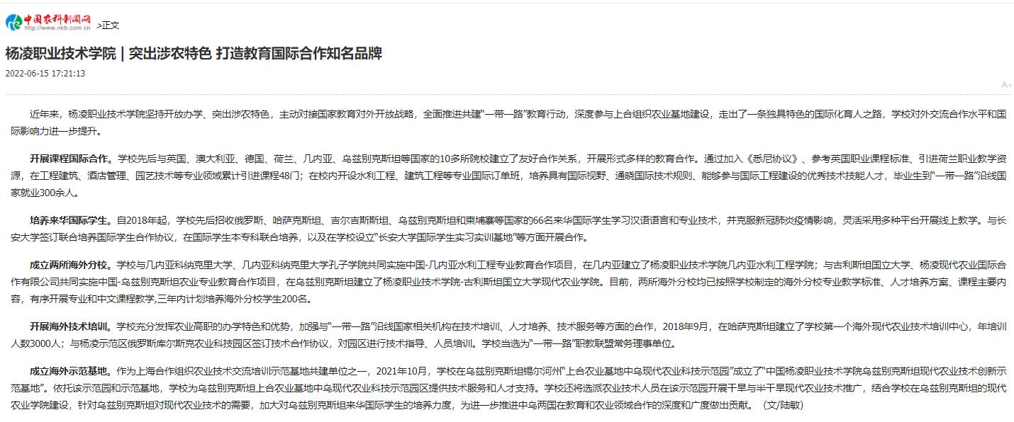 近年来,杨凌职业技术学院坚持开放办学、突出涉农特色,主动对接国家教育对外开放战略,全面推进共建“一带一路”教育行动,深度参与上合组织农业基地建设,走出了一条独具特色的国际化育人之路,学校对外交流合作水平和国际影响力进一步提升。
