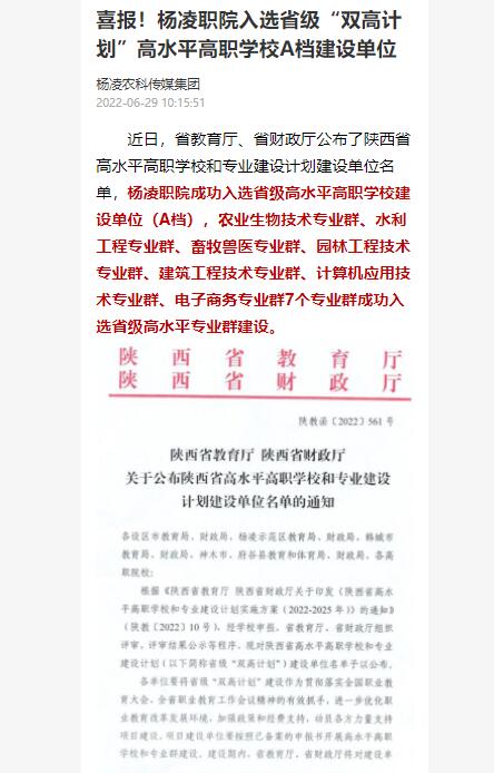 近日,省教育厅、省财政厅公布了陕西省高水平高职学校和专业建设计划建设单位名单,杨凌职院成功入选省级高水平高职学校建设单位(A档),农业生物技术专业群、水利工程专业群、畜牧兽医专业群、园林工程技术专业群、建筑工程技术专业群、计算机应用技术专业群、电子商务专业群7个专业群成功入选省级高水平专业群建设。