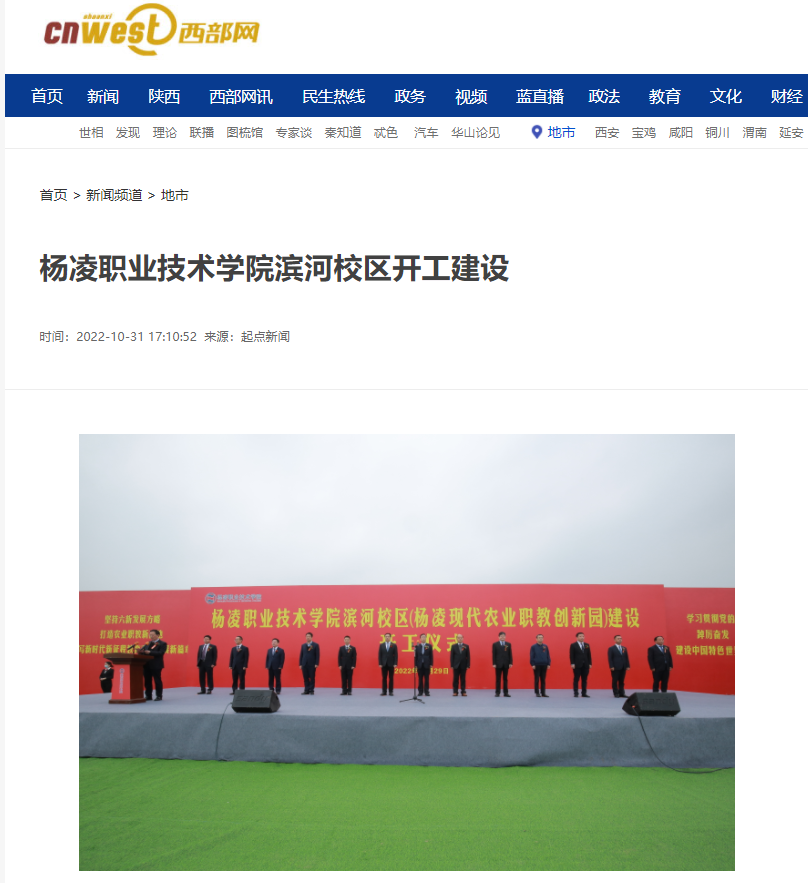 刘建林在讲话中指出,杨凌职业技术学院作为陕西首所挂牌成立的高职院校,长期以来,在省委、省政府的坚强领导下,高举农业职教改革旗帜,坚持立德树人根本,坚守强农兴农使命,积极守正创新、担当作为,各项事业取得的发展有目共睹,是我省乃至全国高职教育的一面旗帜。滨河校区的开工建设是我省职业教育的一件喜事,更是我省贯彻落实党中央、国务院关于大力发展现代职业教育的重大举措。希望学校以此为契机,紧抓发展机遇,汇聚办学力量,努力把滨河校区打造成政、行、企、校四方合作的典范;主动对接国家和我省重大发展战略,集聚创新资源,加大科研攻关,发挥自身优势,为社会培养更多高素质技术技能人才、能工巧匠、大国工匠,更好服务区域经济社会发展,为谱写新征程上陕西高质量发展新篇章作出更大贡献。他表示,省委教育工委、省教育厅将一如既往支持学校朝着建设“中国特色、世界一流职业大学”目标奋勇前进。