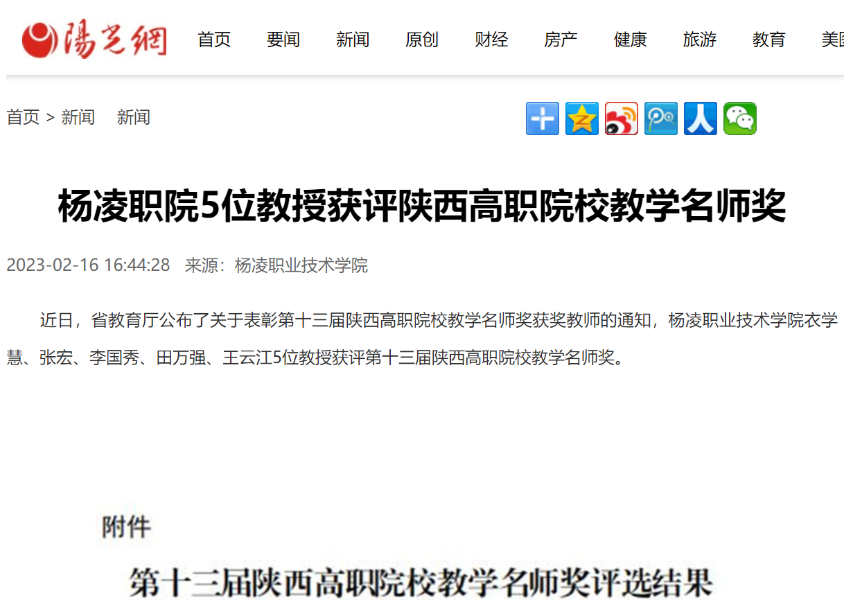 近日,省教育厅公布了关于表彰第十三届陕西高职院校教学名师奖获奖教师的通知,杨凌职业技术学院衣学慧、张宏、李国秀、田万强、王云江5位教授获评第十三届陕西高职院校教学名师奖。