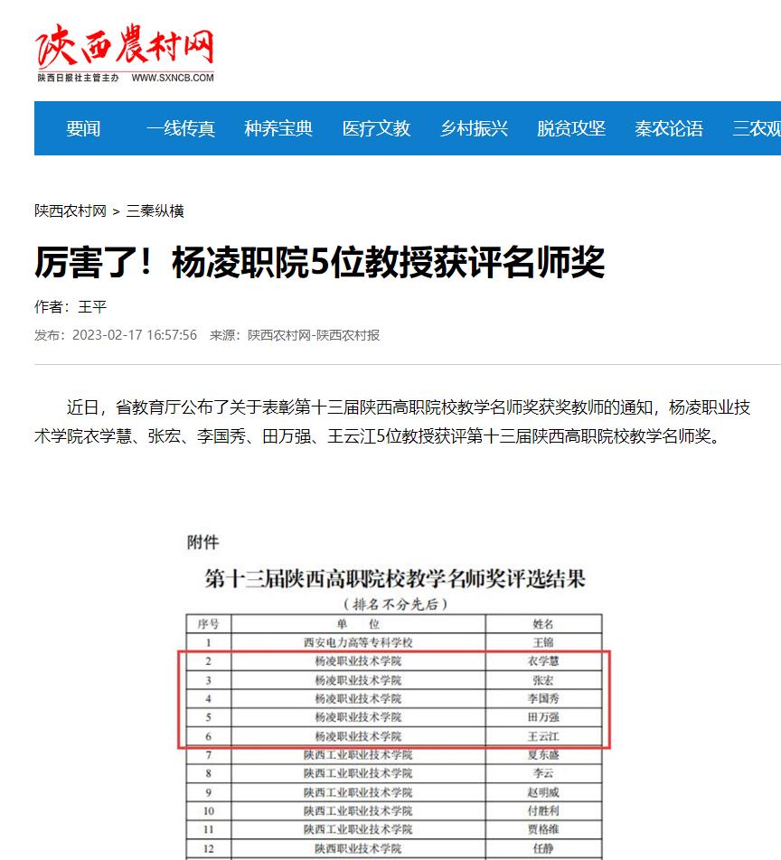 近日,省教育厅公布了关于表彰第十三届陕西高职院校教学名师奖获奖教师的通知,杨凌职业技术学院衣学慧、张宏、李国秀、田万强、王云江5位教授获评第十三届陕西高职院校教学名师奖。
